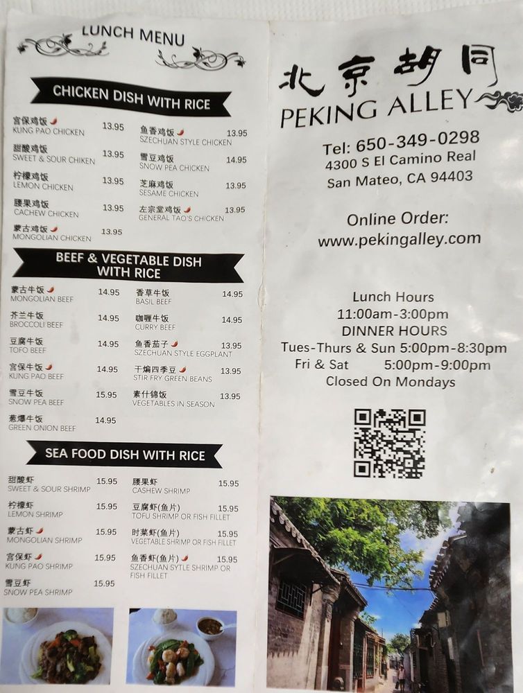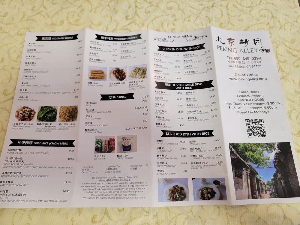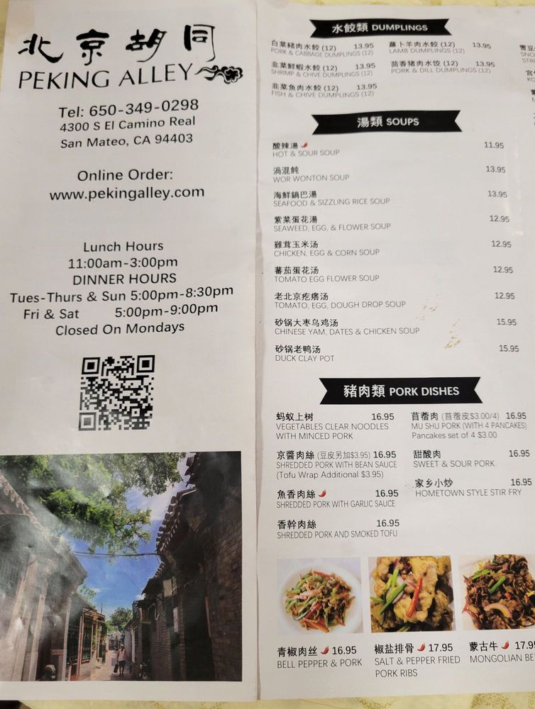Introducing the menu at Peking Alley, a Northern Chinese cuisine restaurant located in San Mateo, CA. The menu features a variety of appetizers, cold dish specialties, and weekend specials that showcase authentic Beijing-style flavors. Standout dishes include the Green Onion Pancake, Beijing Smoked Teriyaki Belt Fish, and Marinated Beef Cartilage. Customers have praised the quality and authenticity of the food, with mentions of favorites like the jianbing with fried dough, Beef Stew and Radishes Claypot, and soft tofu. The restaurant offers a casual dining experience with options for takeout, delivery, and catering. With a cozy ambiance, friendly service, and a focus on traditional Beijing-style fare, Peking Alley is a must-visit for those craving delicious Chinese cuisine.